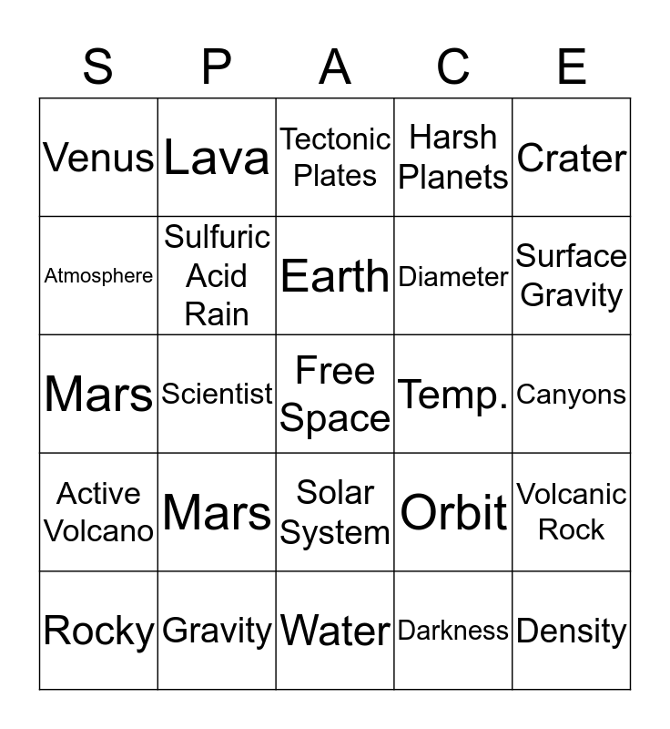 This bingo card has a free space and 24 words: Mars, Gravity, Earth, Rocky, Crater, Venus, Atmosphere, Lava, Temp., Solar System, Diameter, Mars, Orbit, Volcanic Rock, Sulfuric Acid Rain, Darkness, Canyons, Tectonic Plates, Surface Gravity, Scientist, Density, Active Volcano, Harsh Planets and Water.