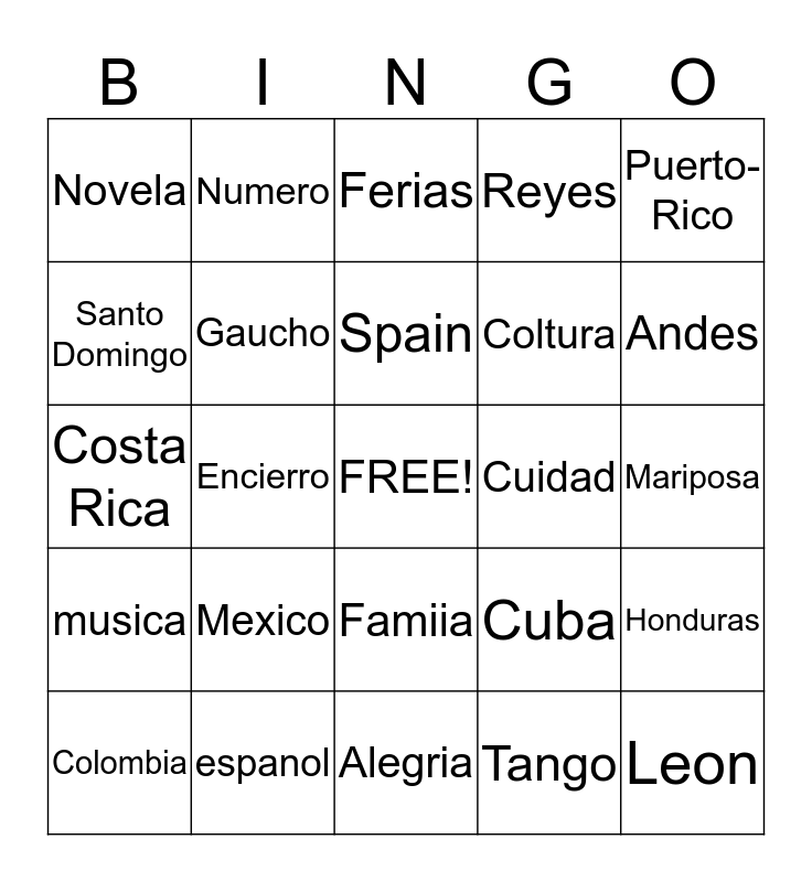 This bingo card has a free space and 24 words: Mexico, espanol, Spain, Colombia, Puerto-Rico, Novela, Santo Domingo, Numero, Cuidad, Famiia, Coltura, Costa Rica, Cuba, Honduras, Gaucho, Tango, Mariposa, Ferias, Andes, Encierro, Leon, musica, Reyes and Alegria.