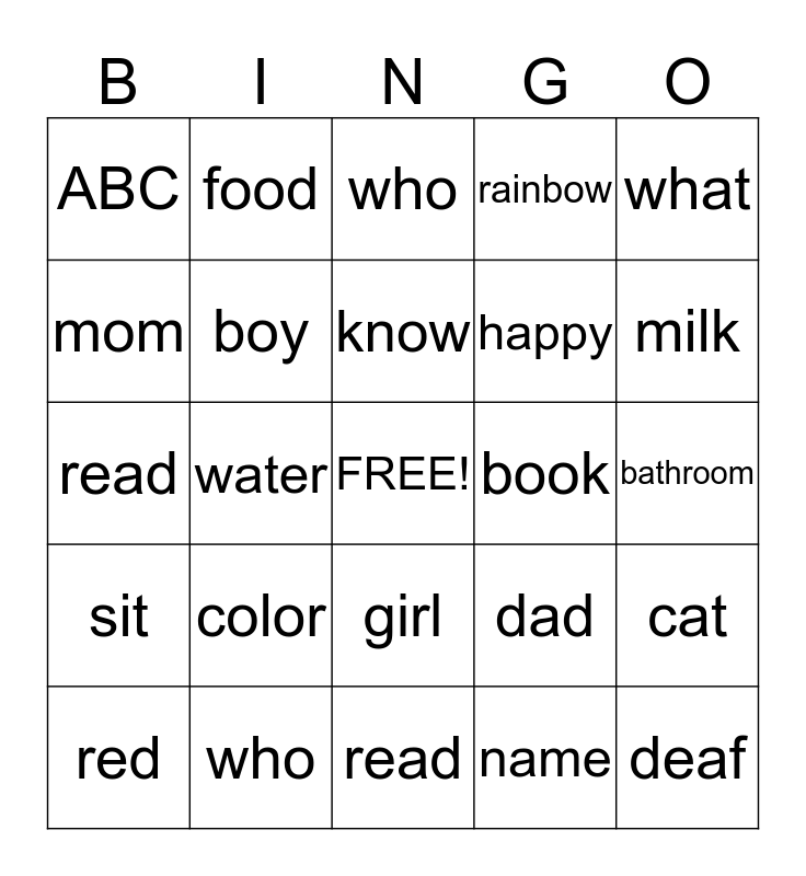 This bingo card has a free space and 24 words: color, who, know, red, what, ABC, mom, food, book, girl, happy, read, dad, cat, boy, name, bathroom, who, milk, water, deaf, sit, rainbow and read.