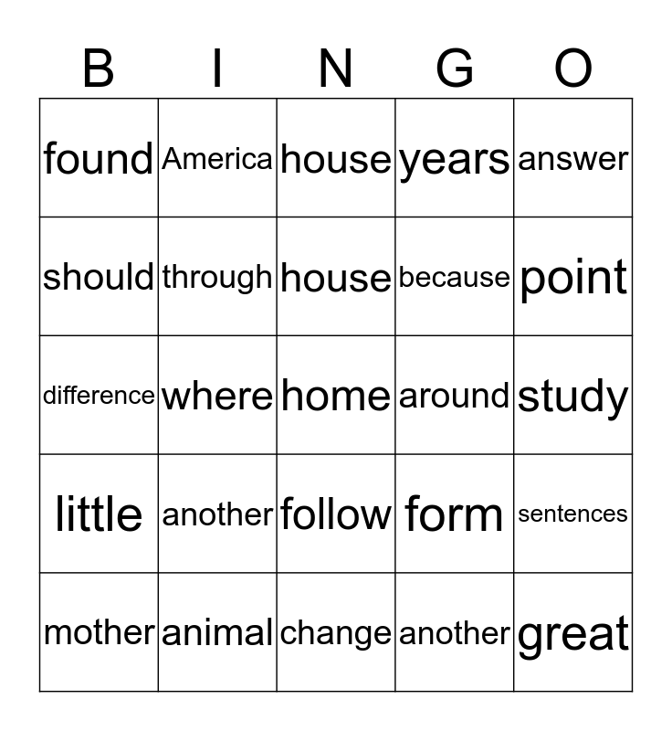 This bingo card has a free space and 24 words: another, animal, house, mother, answer, found, should, America, around, follow, because, difference, form, sentences, through, another, study, house, point, where, great, little, years and change.