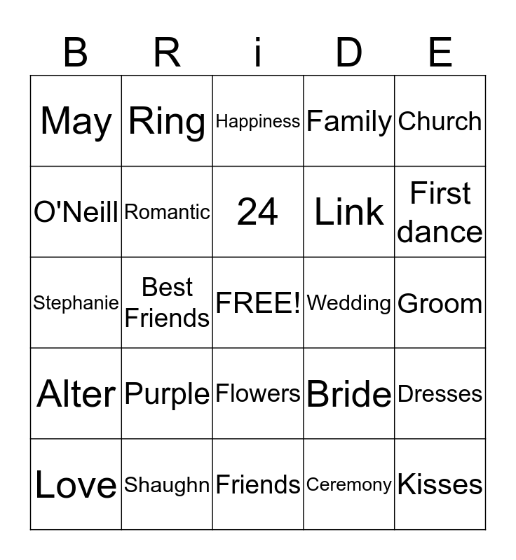 This bingo card has a free space and 24 words: Purple, Shaughn, 24, Love, Church, May, O'Neill, Ring, Wedding, Flowers, Link, Stephanie, Bride, Dresses, Romantic, Ceremony, Groom, Happiness, First dance, Best Friends, Kisses, Alter, Family and Friends.