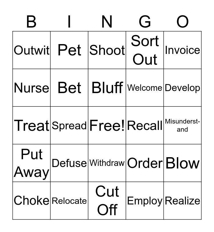 This bingo card has a free space and 24 words: Defuse, Relocate, Bluff, Choke, Invoice, Outwit, Nurse, Pet, Recall, Withdraw, Welcome, Treat, Order, Blow, Bet, Employ, Misunderst-and, Shoot, Develop, Spread, Realize, Put Away, Sort Out and Cut Off.