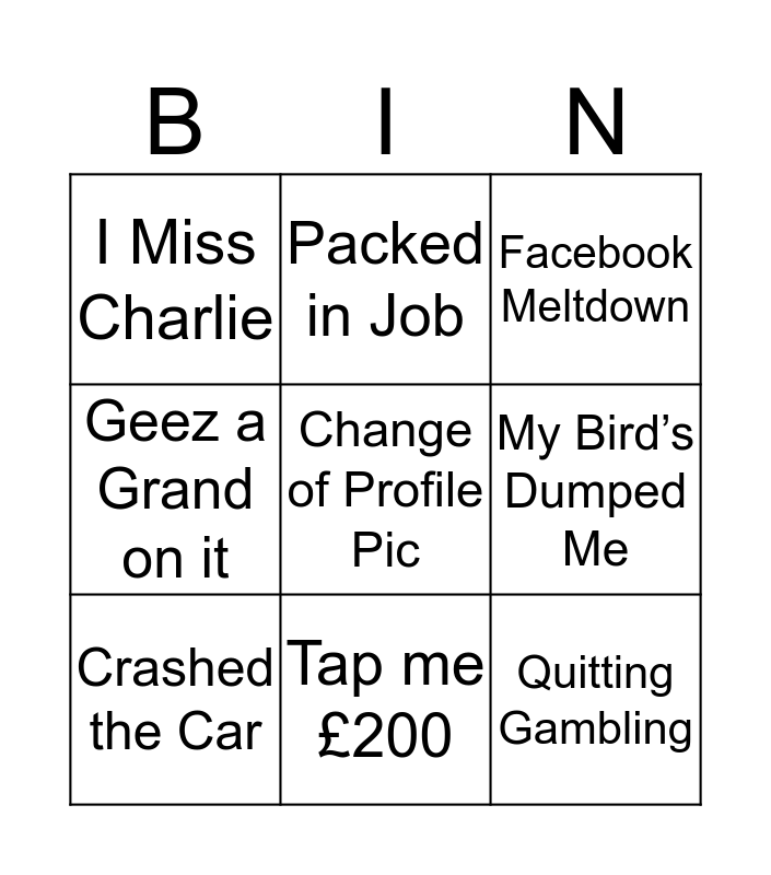 This bingo card has a free space and 8 words: My Bird’s Dumped Me, Facebook Meltdown, Packed in Job, Crashed the Car, I Miss Charlie, Quitting Gambling, Geez a Grand on it and Tap me £200.