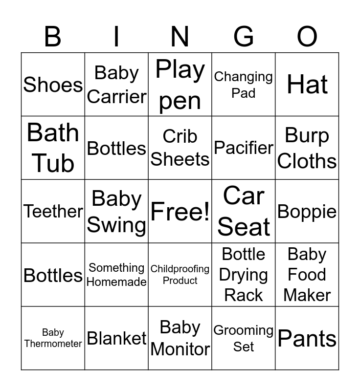 This bingo card has a free space and 62 words: Diapers, Blanket, Book, Bottles, White Onsie, Grey Onsie, Bottles, Baby Clothes, Pacifier, Baby Bag, Changing Pad, Wipes, Bath Tub, Baby Lotion, Baby Soap, Shoes, Pants, Hat, Baby Bathing Suit, Crib Sheets, Car Seat, Play pen, Baby Thermometer, Grooming Set, Rocking Chair, Stroller, Diaper Cream, Baby Food, Baby Food Maker, Bib, Sunglasses, Socks, PJ's, Changing Pad Cover, Boppie, Baby Carrier, Bumbo, High Chair, Baby Swing, Toy, Teether, Baby Spoons, Something Homemade, Diaper Pail, Burp Cloths, Bottle Drying Rack, Bowls, Sippy Cups, Bath Towels, Play mat, Childproofing Product, Baby Monitor, Potty, First Aid Supplies, Nightlight, Wash Cloths, Baby Food Maker, Bottle Brush, Bassinet, Sleep sack, Rattle and Mobile.