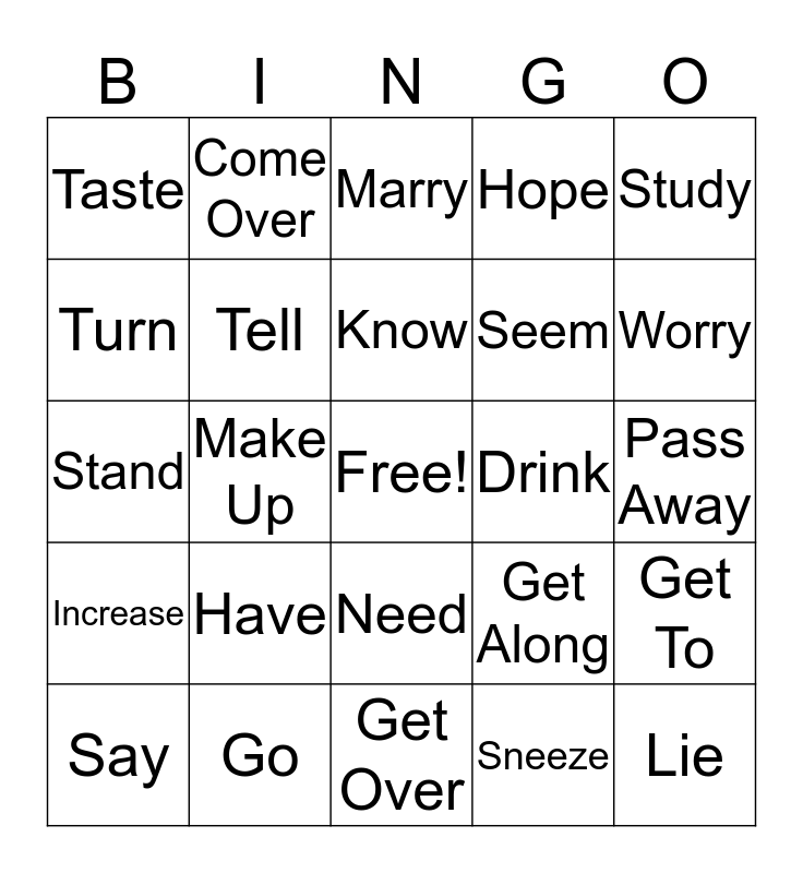 This bingo card has a free space and 24 words: Have, Go, Know, Say, Study, Taste, Turn, Come Over, Drink, Need, Seem, Stand, Get Along, Get To, Tell, Sneeze, Pass Away, Marry, Worry, Make Up, Lie, Increase, Hope and Get Over.
