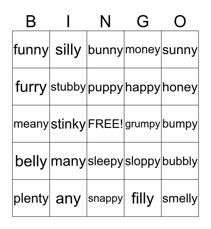 This bingo card has a free space and 24 words: many, any, puppy, plenty, sunny, funny, furry, silly, grumpy, sleepy, happy, meany, sloppy, bubbly, stubby, filly, bumpy, bunny, honey, stinky, smelly, belly, money and snappy.