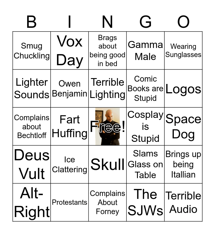 This bingo card has a free space and 24 words: Ice Clattering, Protestants, Terrible Lighting, Alt-Right, Wearing Sunglasses, Smug Chuckling, Lighter Sounds, Vox Day, Cosplay is Stupid, Skull, Comic Books are Stupid, Complains about Bechtloff, Slams Glass on Table, Brings up being Itallian, Owen Benjamin, The SJWs, Space Dog, Brags about being good in bed, Logos, Fart Huffing, Terrible Audio, Deus Vult, Gamma Male and Complains About Forney.