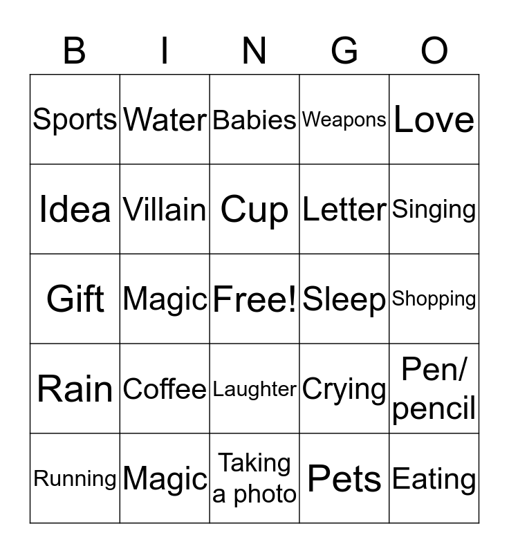 This bingo card has a free space and 29 words: Running, Fixing something, Magic, Phone call/ text, Sports, Babies, Villain, Coffee, Sleep, Magic, Shopping, Eating, Taking a photo, Pets, Singing, Driving/ riding in a car, Laughter, Rain, Love, Gift, Crying, Dancing, Letter, Idea, Weapons, Water, Pen/ pencil, Cup and Bookbag.
