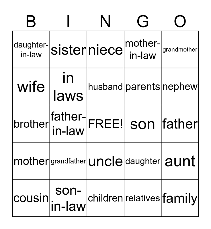 This bingo card has a free space and 24 words: grandfather, son-in-law, husband, cousin, grandmother, daughter-in-law, wife, sister, son, uncle, parents, brother, daughter, aunt, in laws, relatives, father, niece, nephew, father-in-law, family, mother, mother-in-law and children.