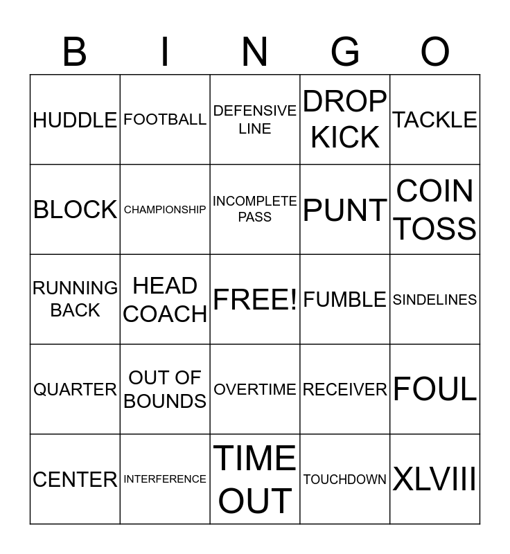 This bingo card has a free space and 60 words: FACE MASK, INTERFERENCE, WILD CARD, QUARTER, TOUCHDOWN, PERSONAL FOUL, CHAMPIONSHIP, LOSSES, PUNT, DEFENSE, DROP KICK, FALSE START, BLOCK, OFFENSIVE LINE, FORMATION, HUDDLE, XLVIII, TACKLE, GRIDIRON, INCOMPLETE PASS, FUMBLE, DEFENSIVE LINE, CENTER, FOUL, 3RD DOWN, END ZONE, LINEBACKER, ARTIFICIAL TURF, COIN TOSS, 1ST & 10, ½ TIME, HEISMAN TROPHY, TAILGATE, POSSESSION, FOOTBALL, INTERCEPTION, WINS, HEAD COACH, PENALTY, RUNNING BACK, PIG SKIN, OUT OF BOUNDS, SINDELINES, PASS, RECEIVER, 1ST DOWN, QUARTER BACK, OFFICIALS, AFL, OVERTIME, TIME OUT, UNNECESSARY ROUGHNESS, NFL, GOAL POST, KICK OFF, OFFENSE, FIELD GOAL, SUPER BOWL, SAFETY and LINE OF SCRIMMAGE.
