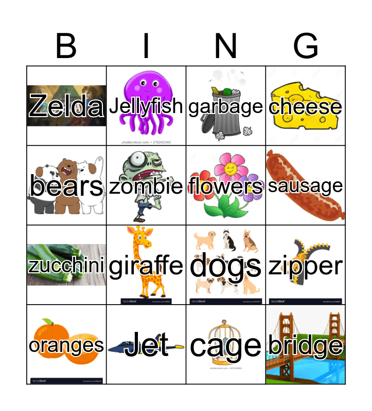 This bingo card has 16 images and 16 words: Jet, zipper, garbage, Zelda, zucchini, Jellyfish, dogs, cage, bears, zombie, oranges, cheese, giraffe, sausage, flowers and bridge.