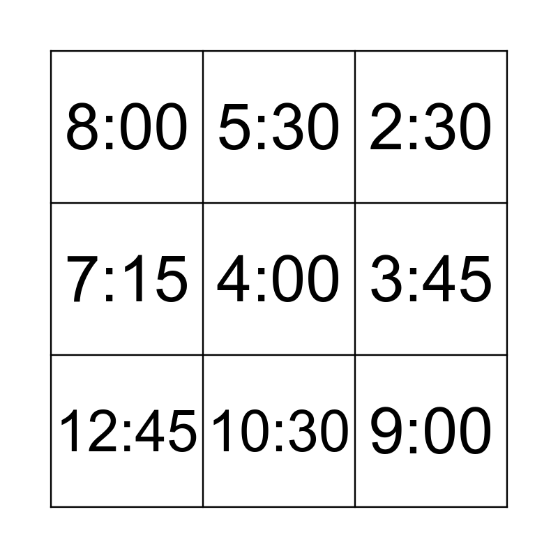 This bingo card has a free space and 8 words: 3:45, 2:30, 5:30, 12:45, 8:00, 9:00, 7:15 and 10:30.