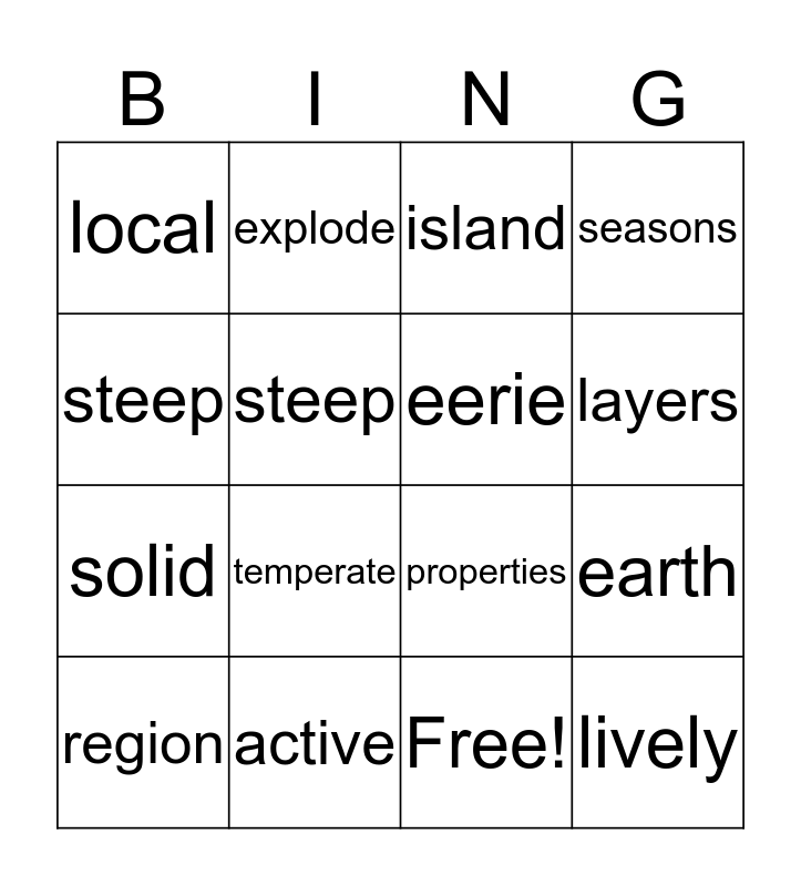 This bingo card has 16 words: active, earth, island, local, solid, explode, properties, Free!, steep, steep, region, seasons, temperate, layers, eerie and lively.
