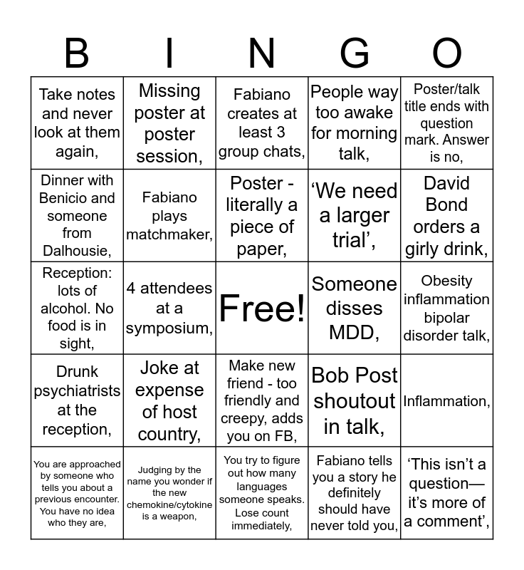 This bingo card has a free space and 64 words: Free space - wine drunk at reception, Bob Post - insightful comment, Kraeplin mentioned in talk,, Inflammation,, Bob Post - mix n match outfit,, Hypomanic Fabiano,, Missing poster at poster session,, Poster about literally the definition of a well defined word,, Poster - literally a piece of paper,, Make new friend - never ever ever see them again,, Make new friend - too friendly and creepy, adds you on FB,, Michael Berk’s sweet research,, Obesity inflammation bipolar disorder talk,, Poster/talk title ends with question mark. Answer is no,, Last talk ghosted by everyone to go explore,, Dinner with Benicio and someone from Dalhousie,, 4 attendees at a symposium,, Take notes and never look at them again,, Forget to attend a whole day of conference,, ‘We need a larger trial’,, Joke at expense of host country,, Drunk psychiatrists at the reception,, People way too awake for morning talk,, All the talks relevant to your research are at 7:30 am. You: never make it to any of them,, Mauricio takes you to a cemetery,, All the good talks are in the morning. You stay out drinking until 3 am and miss all of them,, Lose your shoes at two different parts of a bar,, You don’t attend any of the pre-conference workshops,, Fabiano says ‘Felice Jacka’ at least 6 times in 1 minute,, Fabiano tells the story of having a pizza party with Bob Post,, Somehow Fabiano makes it to all of the talks,, Benicio gives 5 talks in 3 days and leaves before end of conference,, Find out some weird personal stuff about a scientist you admire,, Someone brings their hot new wife,, David Bond orders a girly drink,, You are approached by someone who tells you about a previous encounter. You have no idea who they are,, Chad and Fabiano take their annual photo,, Fabiano tells you a story he definitely should have never told you,, Annual Bob Post and Fabiano kiss,, Fabiano plays matchmaker,, Reception: lots of alcohol. No food is in sight,, Someone disses MDD,, Someone bashes the DSM-5,, Someone gives a talk about a new cytokine/chemokine. You wonder if they made it up,, Someone asks a question. Gives their own keynote,, ‘This isn’t a question— it’s more of a comment’,, Judging by the name you wonder if the new chemokine/cytokine is a weapon,, Someone asks question. Speaker has to clarify with chair what question is. Still cannot answer,, Bob Post shoutout in talk,, Bob Post shouts out in talk,, Get invited to birthday party. Birthday party is on a different continent,, Get invited to at least 3 Brazilian events,, You try to figure out how many languages someone speaks. Lose count immediately,, A researcher you admire tells you about questionable things they did in their youth,, Psychiatrist self-medicates to combat jet lag. It doesn’t work,, Psychiatrist diagnoses another psychiatrist with personality disorder,, Fabiano creates at least 3 group chats,, A Brazilian tries to convince you their caipirinha is the best caipirinha,, Fabiano imports cachaca for someone,, Unsure if Kathleen Merikangas is drunk or sober,, Star researcher is followed by a flock of minions,, Fabiano makes it to ISBD Facebook page,, Get drunk at lunch. Shamefully go back to conference, and Talk/poster title includes ‘big data’. N<20,.