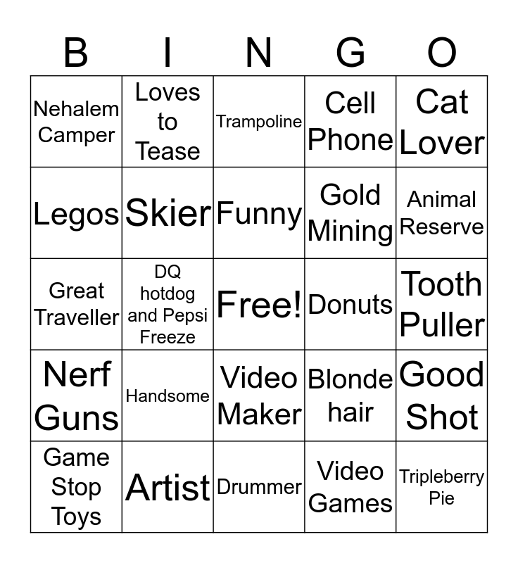 This bingo card has a free space and 24 words: Handsome, Artist, Funny, Game Stop Toys, Cat Lover, Nehalem Camper, Legos, Loves to Tease, Donuts, Video Maker, Gold Mining, Great Traveller, Blonde hair, Good Shot, Skier, Video Games, Tooth Puller, Trampoline, Animal Reserve, DQ hotdog and Pepsi Freeze, Tripleberry Pie, Nerf Guns, Cell Phone and Drummer.