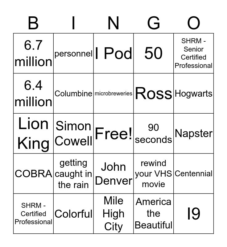 This bingo card has a free space and 24 words: getting caught in the rain, Colorful, microbreweries, SHRM - Certified Professional, SHRM - Senior Certified Professional, 6.7 million, 6.4 million, personnel, 90 seconds, John Denver, Ross, Lion King, rewind your VHS movie, Centennial, Columbine, America the Beautiful, Napster, I Pod, Hogwarts, Simon Cowell, I9, COBRA, 50 and Mile High City.