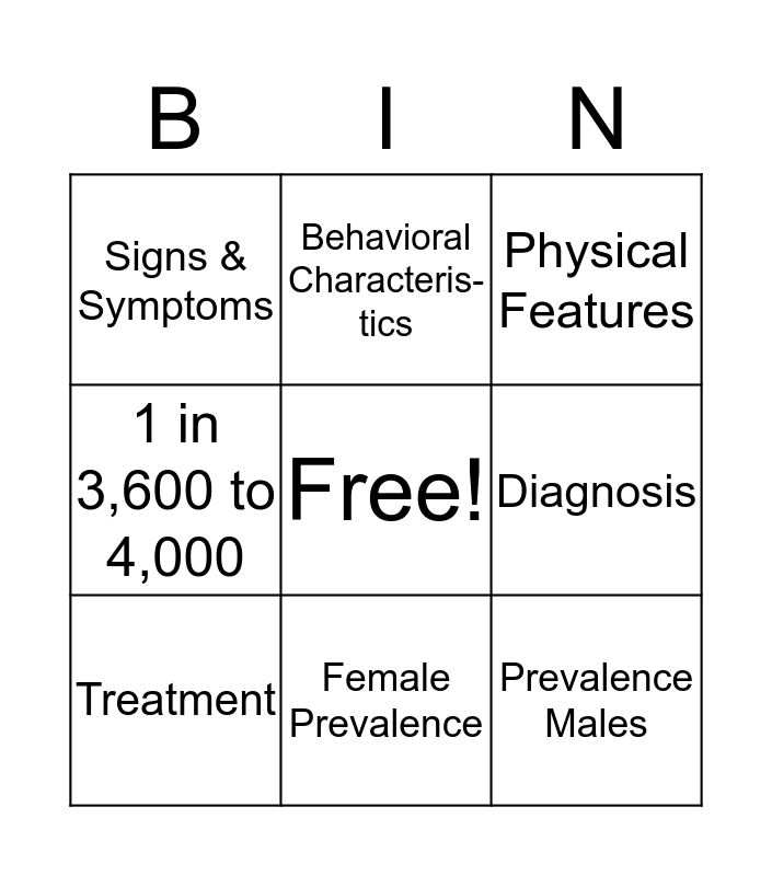 This bingo card has a free space and 9 words: Treatment, Physical Features, Behavioral Characteris-tics, 1 in 3,600 to 4,000, Signs & Symptoms, Diagnosis, Prevalence Males, Definition of FXS and Female Prevalence.