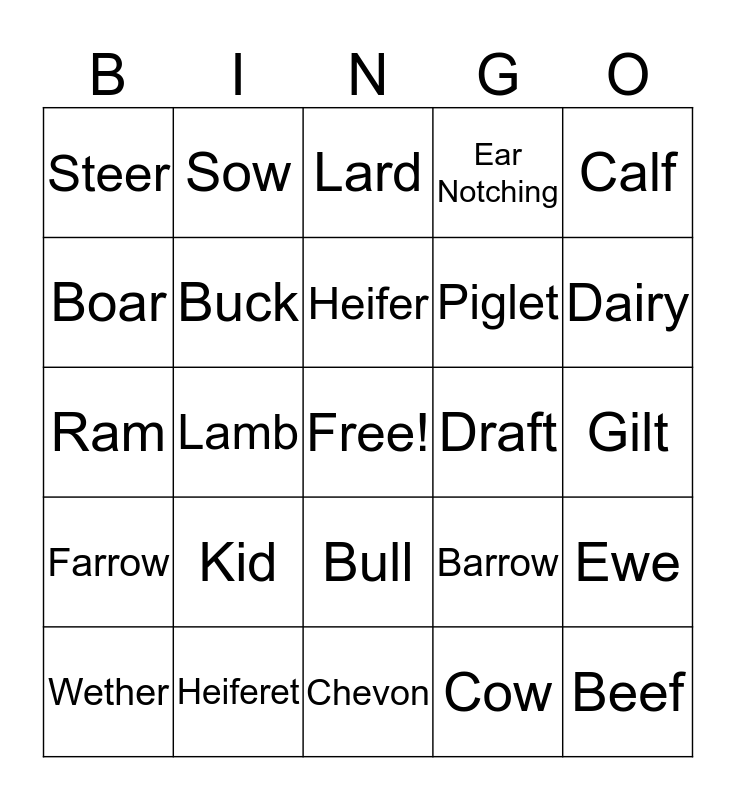 This bingo card has a free space and 26 words: Bull, Cow, Heifer, Heiferet, Calf, Steer, Boar, Sow, Gilt, Barrow, Piglet, Ram, Ewe, Wether, Lamb, Render, Ear Notching, Farrow, Lard, Beef, Dairy, Chevon, Draft, Kid, Buck and Doe.