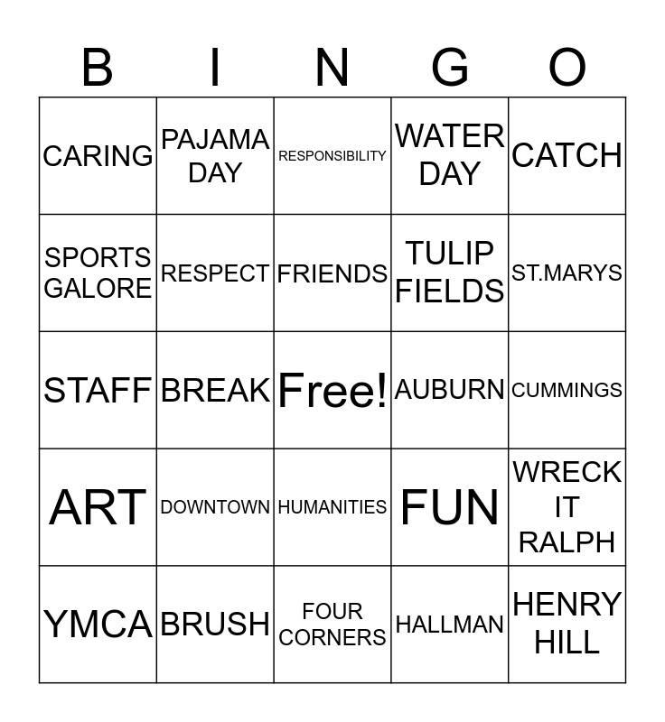 This bingo card has a free space and 29 words: YMCA, SPRING, BREAK, HONESTY, CARING, RESPONSIBILITY, RESPECT, DOWNTOWN, AUBURN, BRUSH, CUMMINGS, HENRY HILL, FOUR CORNERS, HALLMAN, ST.MARYS, STEM, HUMANITIES, ART, CATCH, STAFF, FUN, CAREER DAY, TULIP FIELDS, SPORTS GALORE, WATER DAY, PAJAMA DAY, WRECK IT RALPH, FRIENDS and COMMUNITY.