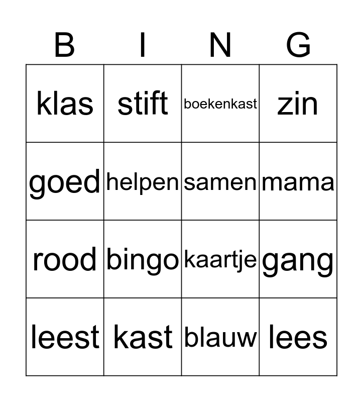 This bingo card has 35 words: lezen, letter, woord, samen, boek, zin, helpen, spel, mama, galgje, kaartje, goed, juf, leesboek, klas, kast, punt, gang, lees, leest, uit, hulp, school, meester, boekenkast, bingo, plein, kind, rood, blauw, groen, geel, pen, stift and papier.