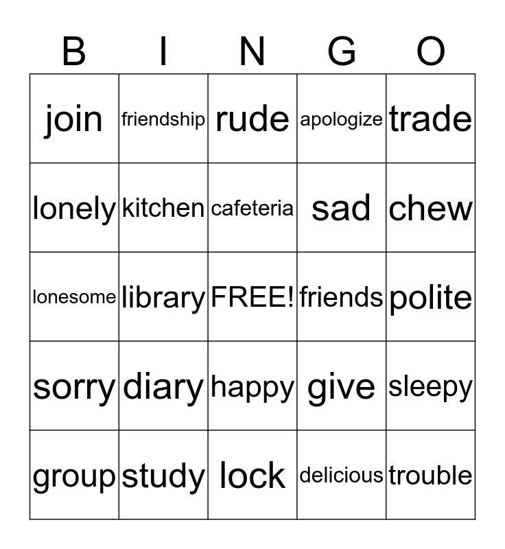 This bingo card has a free space and 25 words: diary, lock, cafeteria, group, trade, join, lonely, friendship, friends, happy, sad, lonesome, give, sleepy, kitchen, manners, polite, rude, chew, library, trouble, study, sorry, apologize and delicious.