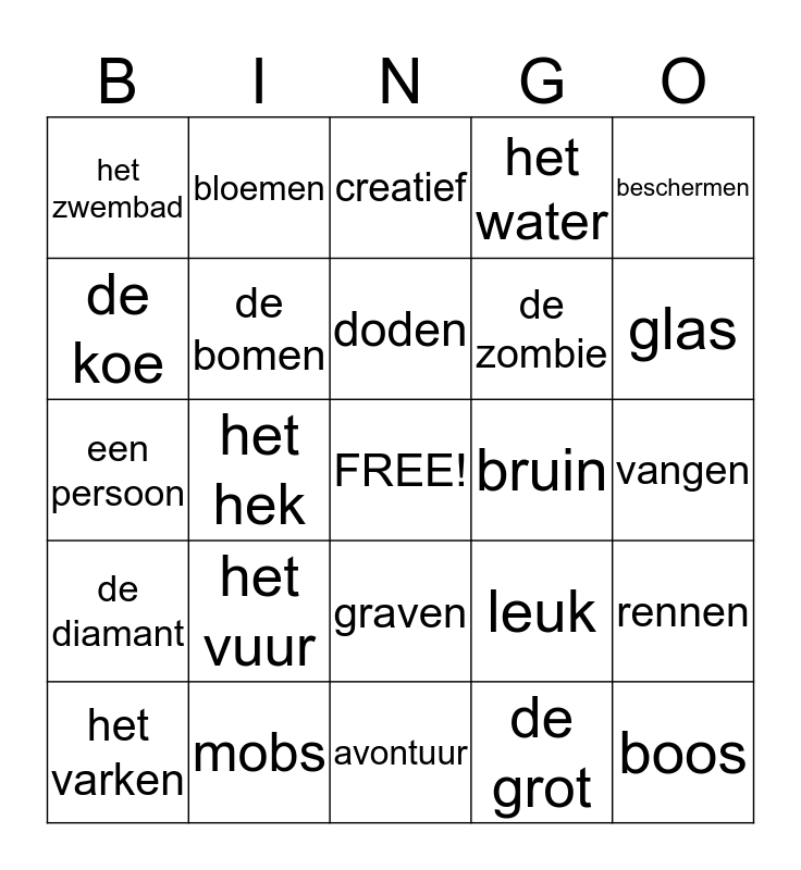 This bingo card has a free space and 63 words: eten, vissen, springen, rennen, bouwen, varen, bloemen, vechten, doden, hakken, graven, drinken, vangen, beschermen, het huis, de koe, het hek, het zwembad, de kip, de zombie, het vuur, de diamant, het water, de aarde, het goud, de schaap, de server, het zand, de boot, de wol, de wolf, het gras, het mannetje, het hout, glas, het varken, de bot, de grot, de bladeren, de bomen, een persoon, bruin, blauw, groen, boos, mobs, spannend, leuk, mooi, blokkig, snel, avontuur, moed, het bos, voorwerpen, creatief, ontwikkeling, mojang, betoveren, handelen, het paard, de computer and steen.