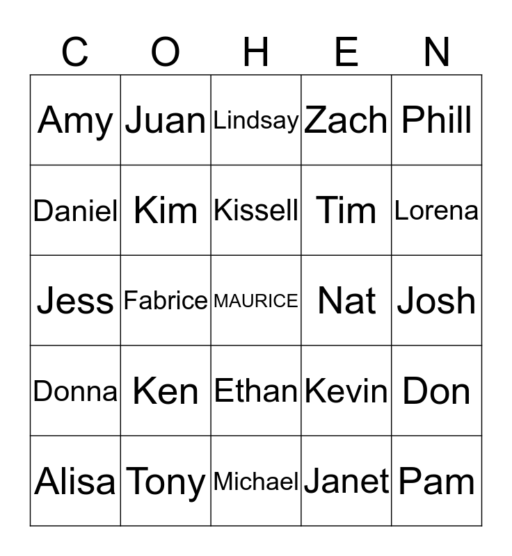 This bingo card has a free space and 59 words: Eric, Tony, Alex, Donna, Janet, Clodfelter, Kim, Robin, Tim, Caleb, Zach, Rosen, Daniel, Franci, Rachel, Amy, Pam, Phill, Stephanie, Kissell, Nat, Lindsay, Alisa, Don, Lynn, Matt, Jordan, Georgina, Lorena, Jiehui, Alexis, Anastasia, Abby, Antonio, Juan, Michelle, Jobe, Fabrice, Rafay, Jess, Myron, Ken, Josh, Cyndi, Liz, Tess, Burt, Jeff, Ethan, Michael, Andy, Mathew, Carlos, Justus, Jared, Kevin, Shaun, Richard and Jordan.