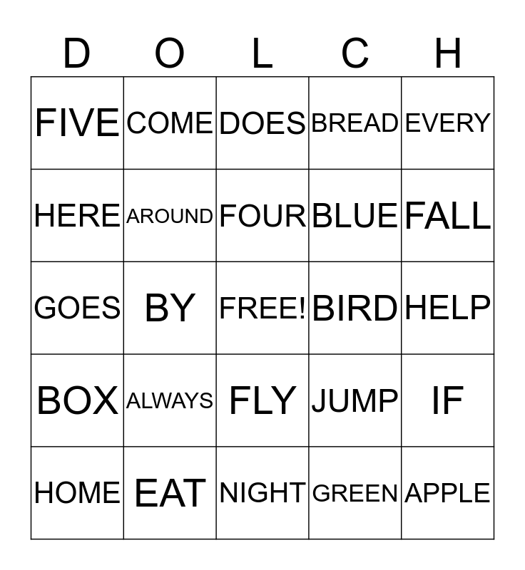 This bingo card has a free space and 24 words: ALWAYS, EAT, FOUR, HOME, EVERY, FIVE, HERE, COME, BIRD, FLY, BLUE, GOES, JUMP, IF, AROUND, GREEN, HELP, DOES, FALL, BY, APPLE, BOX, BREAD and NIGHT.
