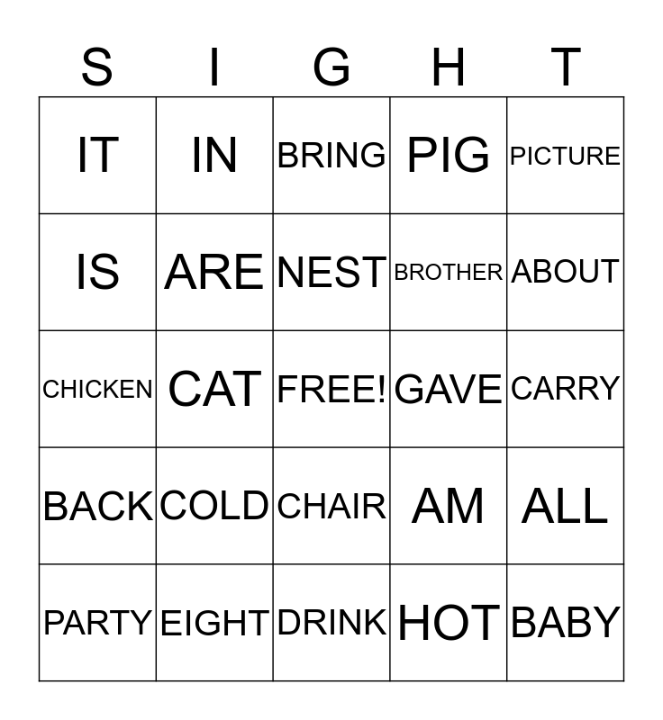 This bingo card has a free space and 24 words: COLD, EIGHT, NEST, PARTY, PICTURE, IT, IS, IN, GAVE, CHAIR, BROTHER, CHICKEN, AM, ALL, ARE, HOT, CARRY, BRING, ABOUT, CAT, BABY, BACK, PIG and DRINK.