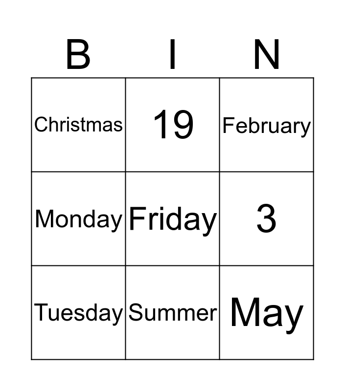 This bingo card has 9 words: Tuesday, February, 19, Monday, Christmas, 3, Friday, May and Summer.