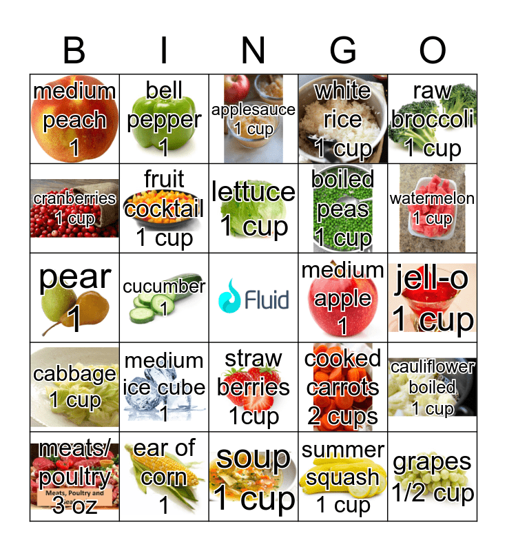 This bingo card has 24 images, a free space and 24 words: medium ice cube 1, ear of corn 1, lettuce 1 cup, meats/ poultry 3 oz, raw broccoli 1 cup, medium peach 1, cranberries 1 cup, bell pepper 1, medium apple 1, straw berries 1cup, boiled peas 1 cup, pear 1, cooked carrots 2 cups, cauliflower boiled 1 cup, fruit cocktail 1 cup, summer squash 1 cup, jell-o 1 cup, applesauce 1 cup, watermelon 1 cup, cucumber 1, grapes 1/2 cup, cabbage 1 cup, white rice 1 cup and soup 1 cup.