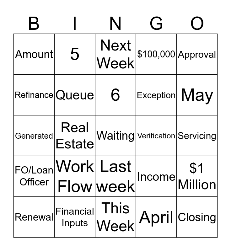 This bingo card has a free space and 29 words: Renewal, Term/ IT, Real Estate, Operating, Amount, Next Week, Queue, Work Flow, Verification, Financial Inputs, Servicing, Closing, This Week, April, May, June, Last week, FO/Loan Officer, Approval, Generated, Income, New Money, Exception, Refinance, $100,000, 5, $1 Million, 6 and 2.