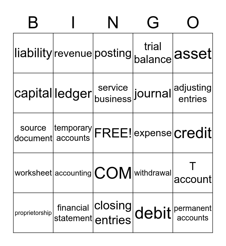 This bingo card has a free space and 24 words: accounting, financial statement, service business, proprietorship, asset, liability, capital, revenue, expense, COM, journal, source document, withdrawal, T account, ledger, debit, credit, posting, adjusting entries, temporary accounts, permanent accounts, worksheet, trial balance and closing entries.