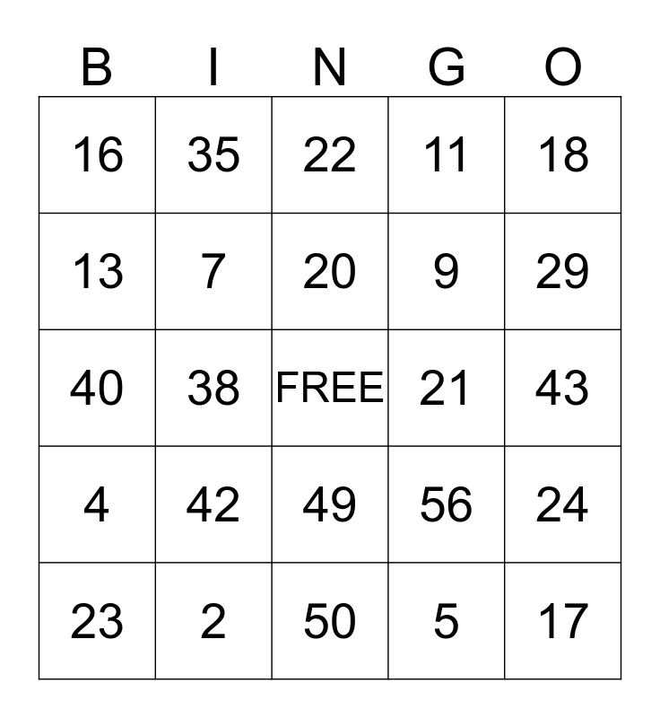 This bingo card has a free space and 59 words: 1, 2, 3, 4, 5, 6, 7, 8, 9, 10, 11, 12, 13, 14, 15, 16, 17, 18, 19, 20, 21, 22, 23, 24, 25, 26, 27, 28, 29, 30, 31, 32, 33, 34, 35, 36, 37, 38, 39, 40, 41, 42, 43, 44, 45, 46, 47, 48, 49, 50, 51, 52, 53, 54, 55, 56, 57, 58 and 59.