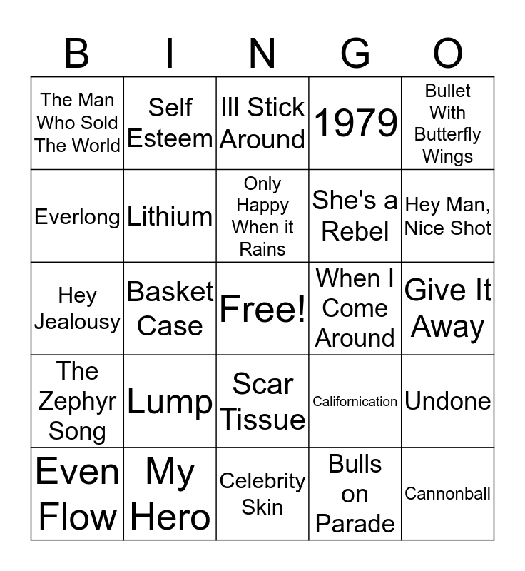 This bingo card has a free space and 29 words: Even Flow, Cherub Rock, Basket Case, Smells Like Teen Spirit, The Man Who Sold The World, Ill Stick Around, Lithium, Lump, When I Come Around, My Hero, Give It Away, Cannonball, Celebrity Skin, Bulls on Parade, Hey Man, Nice Shot, My Name Is Jonas, Scar Tissue, The Zephyr Song, Bullet With Butterfly Wings, Hey Jealousy, Californication, Losing My Religion, She's a Rebel, Everlong, 1979, Self Esteem, Undone, Only Happy When it Rains and About a Girl.