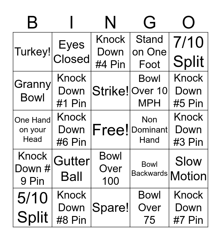 This bingo card has a free space and 25 words: Gutter Ball, Spare!, Strike!, 5/10 Split, 7/10 Split, Turkey!, Granny Bowl, Eyes Closed, Non Dominant Hand, Bowl Over 100, Bowl Over 10 MPH, One Hand on your Head, Bowl Backwards, Slow Motion, Knock Down #1 Pin, Knock Down #2 Pin, Knock Down #3 Pin, Knock Down #4 Pin, Knock Down #5 Pin, Knock Down #6 Pin, Knock Down #7 Pin, Knock Down #8 Pin, Knock Down # 9 Pin, Stand on One Foot and Bowl Over 75.