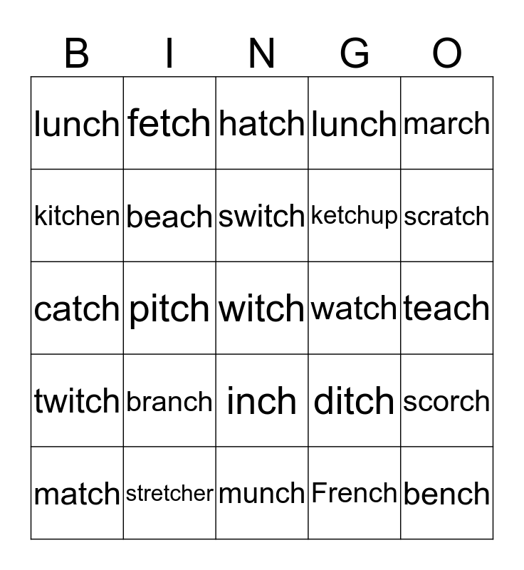 This bingo card has a free space and 24 words: branch, stretcher, switch, match, march, lunch, kitchen, fetch, watch, inch, ketchup, catch, ditch, scorch, beach, French, teach, hatch, scratch, pitch, bench, twitch, lunch and munch.