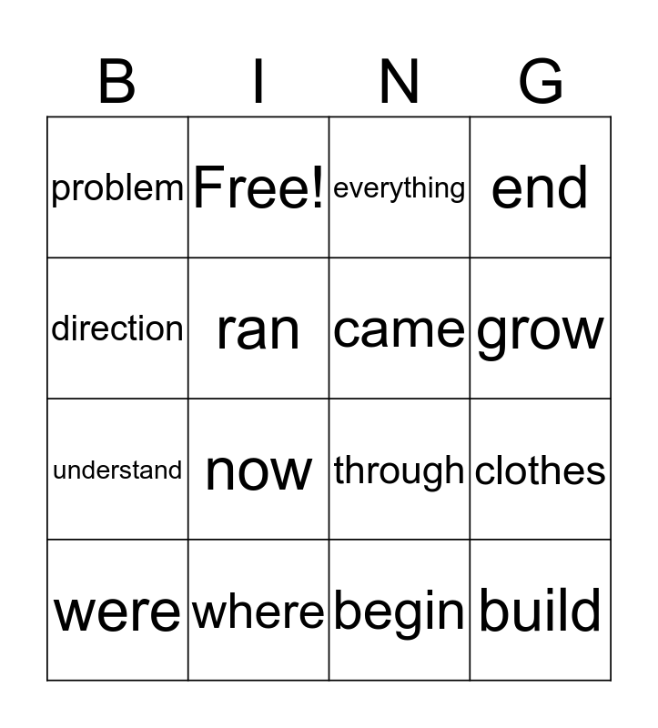 This bingo card has 19 words: through, several, everything, build, clothes, direction, begin, problem, Free!, understand, now, ran, came, where, were, said, end, grow and hour.