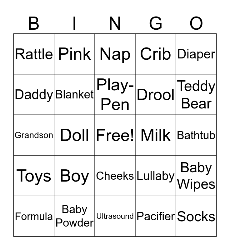 This bingo card has a free space and 60 words: Baby, Baby Powder, Girl Cry Baby, Toys, Pacifier, Boy Cry Baby, Blanket, Baby Bottle, Drool, Baby Fart, Crib, Mommy, Daddy, Games, Stroller, Rattle, Socks, Diaper, Twins, Play-Pen, Milk, Nap, Formula, Baby Wipes, Baby Lotion, Baby Shampoo, Grandma, Giggles, Teddy Bear, Rubber Duck, Mittens, Love, Pajamas, Booties, Pink, Flowers, Swing, Doll, Granddaughter, Grandson, Girl, Boy, Bathtub, Blue, Lullaby, Gifts, Gerber, Little Hands, Little Feet, Cheeks, Ultrasound, Pelo, Little Eyes, Son, Daughter, Hospital, Hug, Kiss, Carry and Wash.