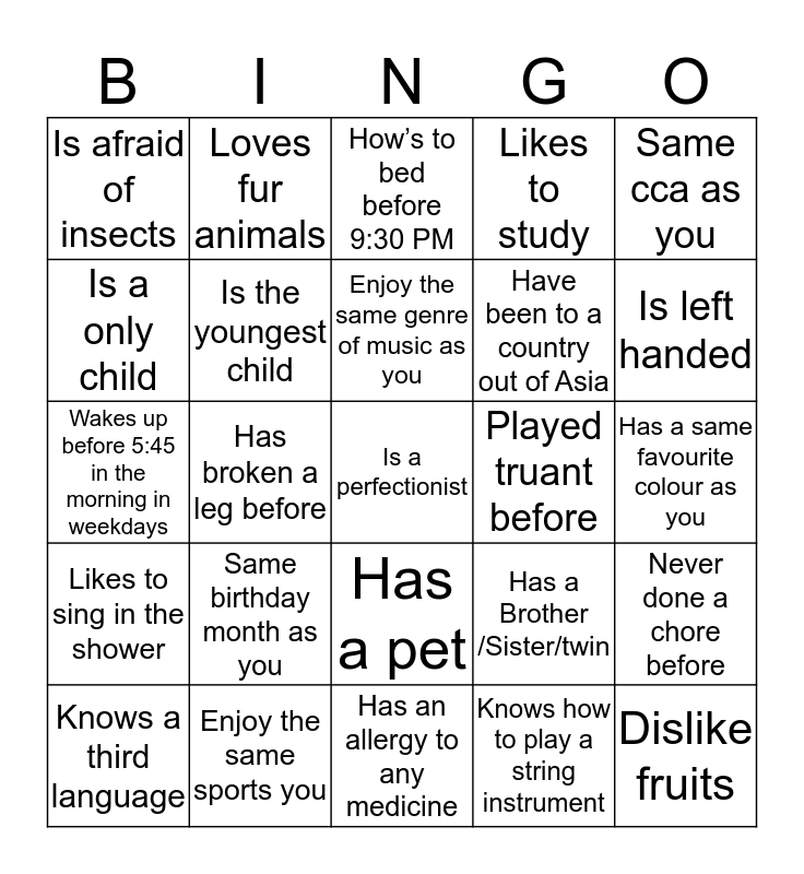 This bingo card has a free space and 24 words: Same birthday month as you, Enjoy the same sports you, Enjoy the same genre of music as you, Knows a third language, Same cca as you, Is afraid of insects, Is a only child, Loves fur animals, Played truant before, Has a pet, Have been to a country out of Asia, Wakes up before 5:45 in the morning in weekdays, Has a Brother /Sister/twin, Never done a chore before, Is the youngest child, Knows how to play a string instrument, Has a same favourite colour as you, How’s to bed before 9:30 PM, Is left handed, Has broken a leg before, Dislike fruits, Likes to sing in the shower, Likes to study and Has an allergy to any medicine.