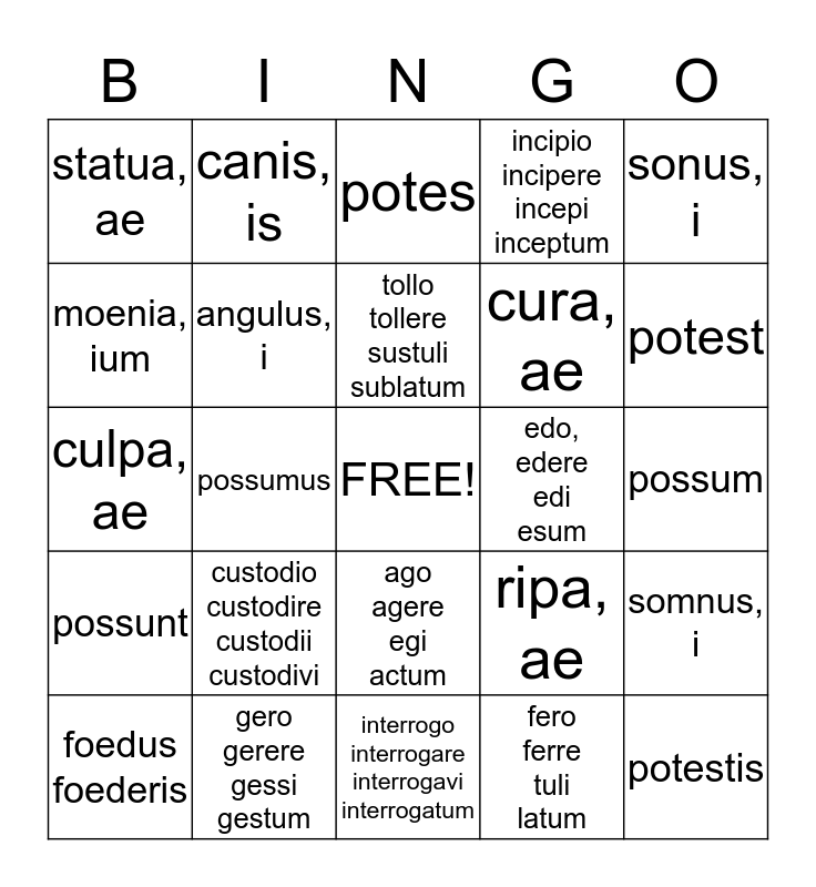 This bingo card has a free space and 24 words: custodio custodire custodii custodivi, gero gerere gessi gestum, tollo tollere sustuli sublatum, foedus foederis, sonus, i, statua, ae, moenia, ium, canis, is, edo, edere edi esum, ago agere egi actum, cura, ae, culpa, ae, ripa, ae, somnus, i, angulus, i, fero ferre tuli latum, possum, potes, potest, possumus, potestis, possunt, incipio incipere incepi inceptum and interrogo interrogare interrogavi interrogatum.