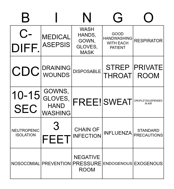 This bingo card has a free space and 24 words: 3 FEET, PREVENTION, DISPOSABLE, NOSOCOMIAL, RESPIRATOR, C-DIFF., CDC, MEDICAL ASEPSIS, SWEAT, CHAIN OF INFECTION, STREP THROAT, 10-15 SEC, INFLUENZA, STANDARD PRECAUTIONS, DRAINING WOUNDS, ENDOGENOUS, DROPLETSSUSPENDED IN AIR, WASH HANDS, GOWN, GLOVES, MASK, PRIVATE ROOM, GOWNS, GLOVES, HAND WASHING, EXOGENOUS, NEUTROPENIC ISOLATION, GOOD HANDWASHING WITH EACH PATIENT and NEGATIVE PRESSURE ROOM.