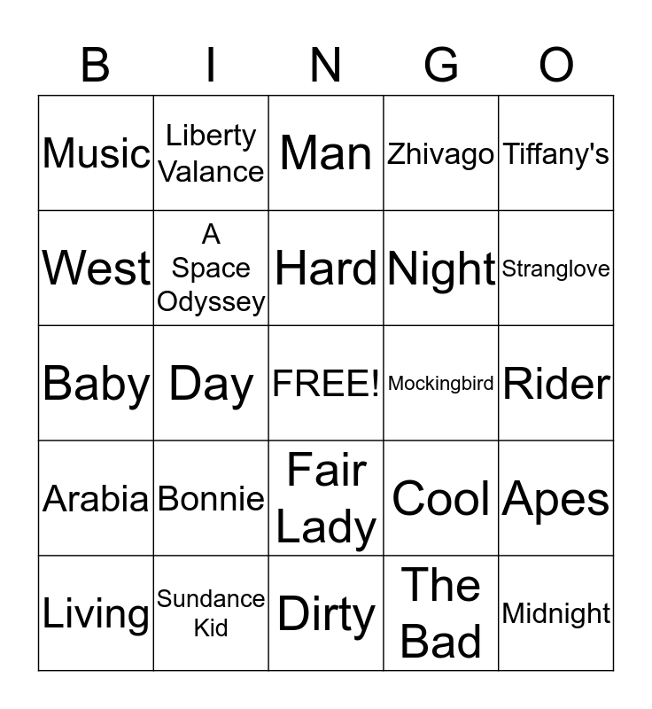 This bingo card has a free space and 24 words: Bonnie, Sundance Kid, Hard, Living, Tiffany's, Music, West, Liberty Valance, Mockingbird, Fair Lady, Night, Baby, Cool, Apes, A Space Odyssey, The Bad, Rider, Man, Stranglove, Day, Midnight, Arabia, Zhivago and Dirty.