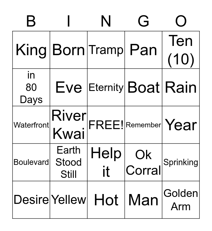 This bingo card has a free space and 24 words: Earth Stood Still, Yellew, Eternity, Desire, Ten (10), King, in 80 Days, Born, Remember, Help it, Boat, Waterfront, Ok Corral, Sprinking, Eve, Man, Year, Tramp, Rain, River Kwai, Golden Arm, Boulevard, Pan and Hot.