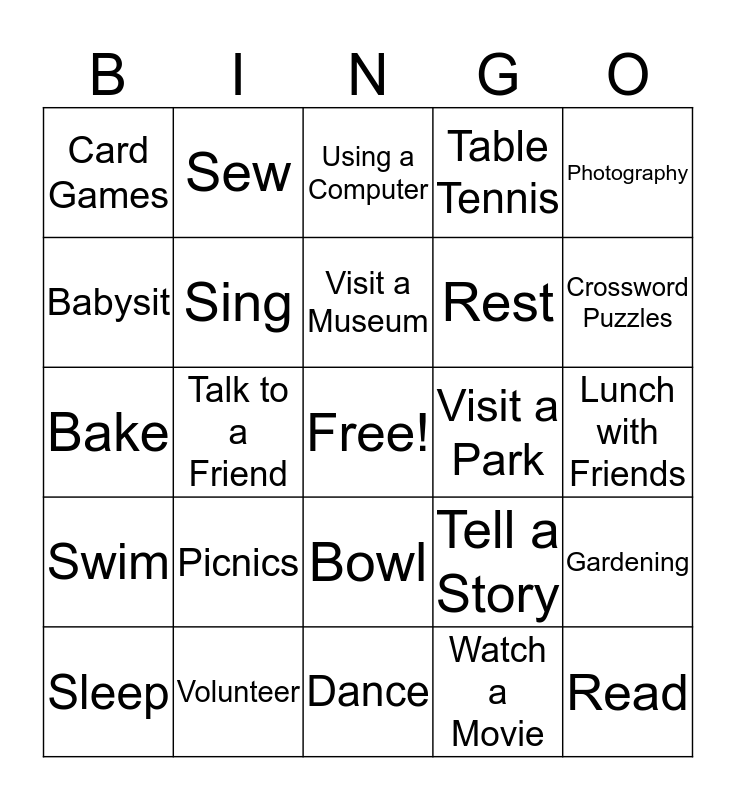 This bingo card has a free space and 34 words: Plan a Party, Cook, Listen to Music, Bird Watching, Lunch with Friends, Babysit, Sing, Dance, Rest, Read, Bake, Sew, Watch a Movie, Fishing, Swim, Talk to a Friend, Bowl, Visit a Park, Gardening, Sleep, Volunteer, Camp, Table Tennis, Crossword Puzzles, Jigsaw Puzzles, Picnics, Using a Computer, Flower Arranging, Photography, Card Games, Painting, Visit a Museum, Tell a Story and Visit Family.