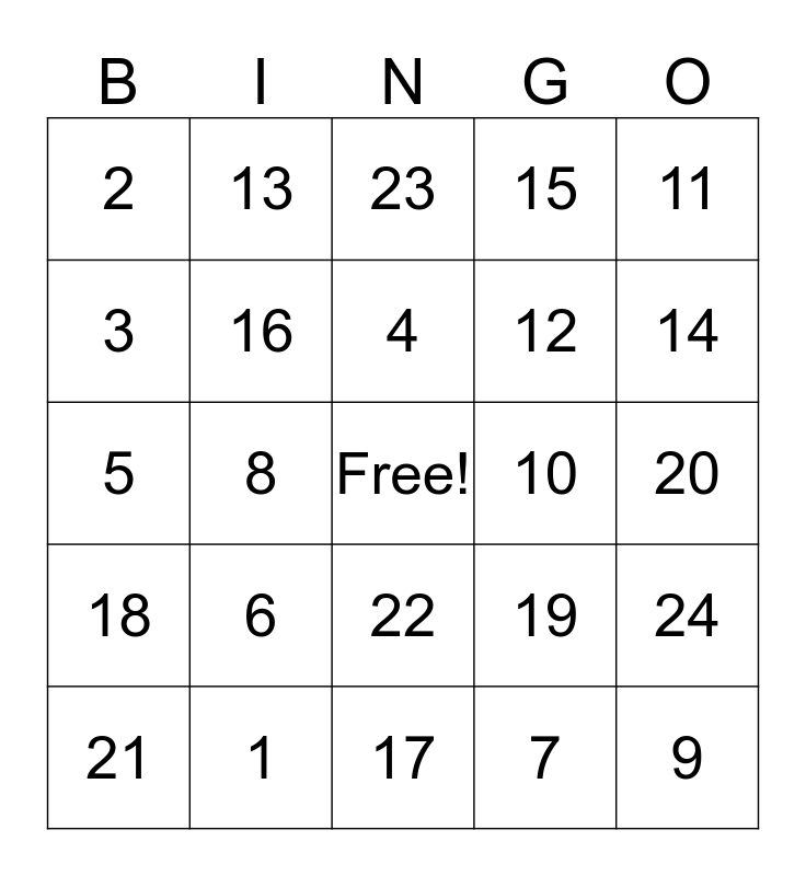 This bingo card has a free space and 24 words: 6, 1, 4, 21, 11, 2, 3, 13, 10, 22, 12, 5, 19, 24, 16, 7, 20, 23, 14, 8, 9, 18, 15 and 17.