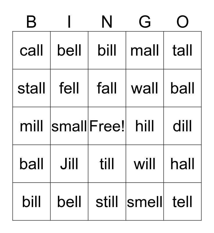 This bingo card has a free space and 27 words: will, well, wall, still, stall, bill, bell, ball, hill, hall, mill, mall, bill, bell, ball, fill, fell, fall, Jill, call, dill, smell, small, tell, till, tall and drill.