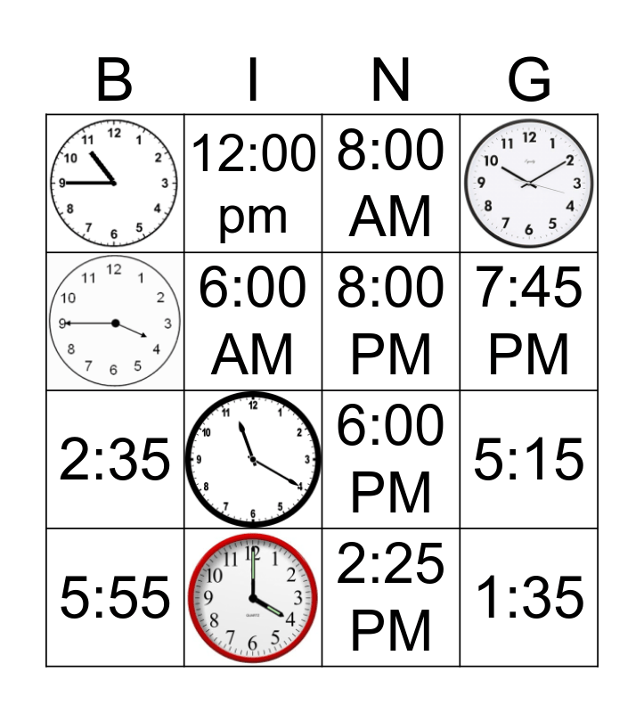 This bingo card has 8 images and 12 words: 5:15, 3:05, 8:00 AM, 5:55, 2:35, 12:00 pm, 6:00 PM, 6:00 AM, 1:35, 8:00 PM, 7:45 PM and 2:25 PM.
