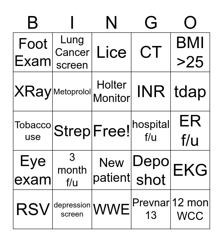 This bingo card has a free space and 29 words: RSV, Mycoplasm, Strep, BP >140/90, Foot Exam, Lice, Metoprolol, 3 month f/u, hospital f/u, depression screen, ER f/u, 12 mon WCC, WWE, Prevnar 13, tdap, DOT physical, New patient, Eye exam, BMI >25, Tobacco use, Depo shot, Critical lab, INR, XRay, CT, Lung Cancer screen, EKG, Holter Monitor and Transfer to ER.