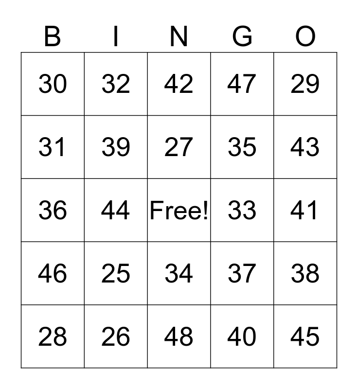 This bingo card has a free space and 24 words: 25, 26, 27, 28, 29, 30, 31, 32, 33, 34, 35, 36, 37, 38, 39, 40, 41, 42, 43, 44, 45, 46, 47 and 48.